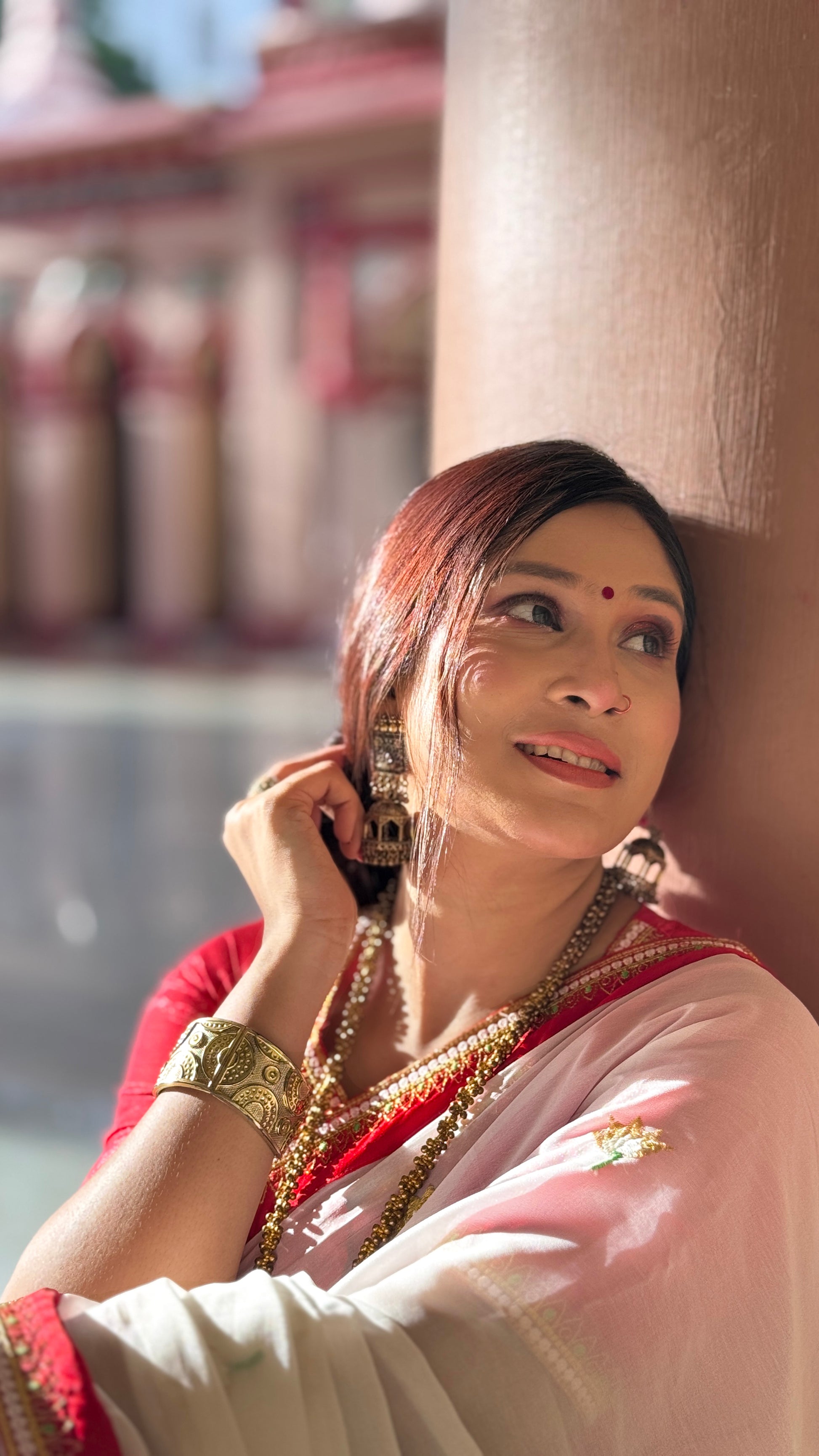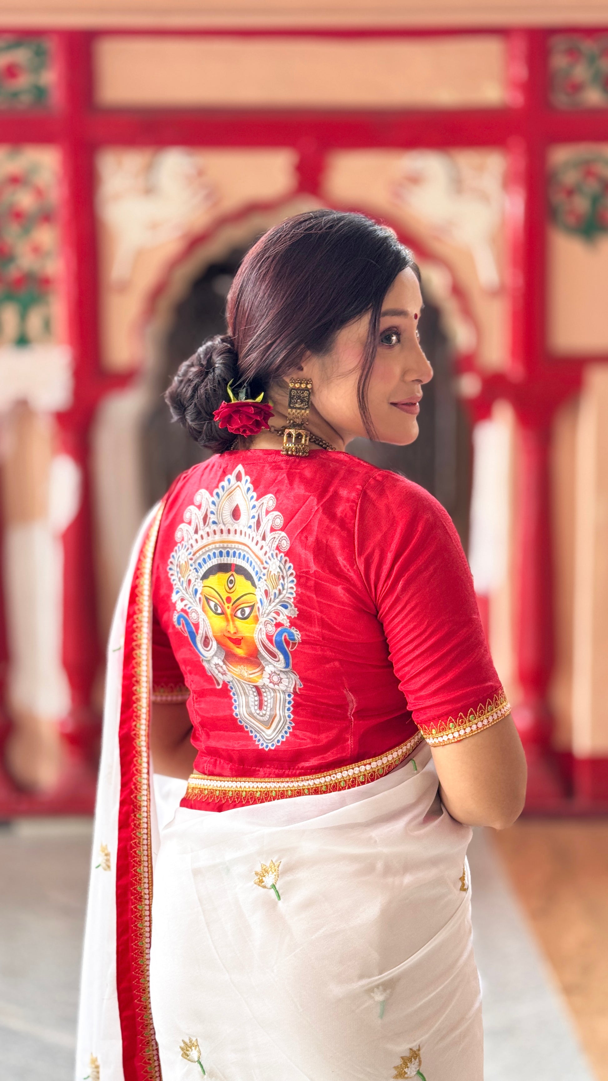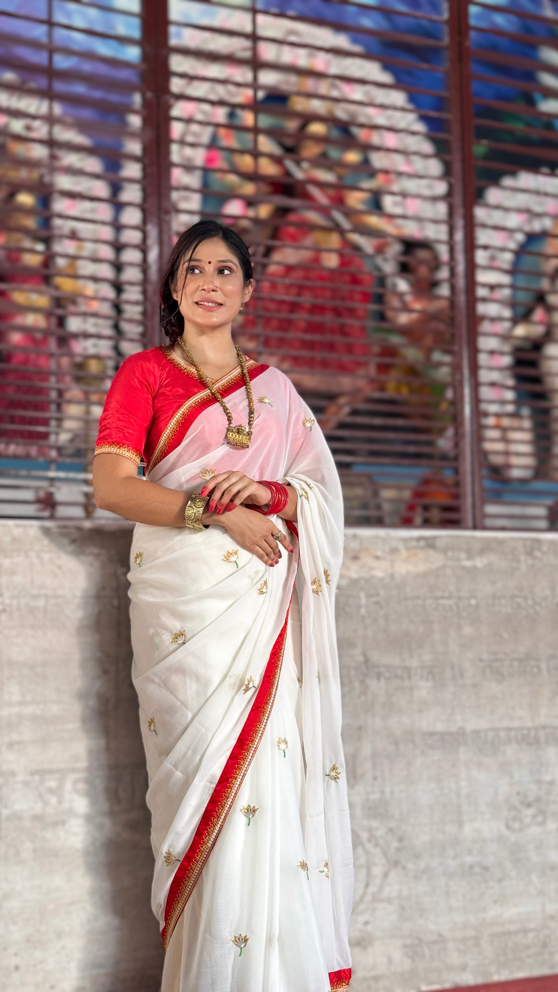 Embrace timeless elegance with this classic white saree, beautifully paired with a bold red blouse. The saree features a rich red and gold embroidered border that adds a regal charm, while delicate gold embroidery lotus are scattered throughout the body, enhancing its traditional allure. Perfectly complemented by a deep red blouse with matching golden detailing, this ensemble radiates grace and cultural sophistication. Ideal for festive occasions, puja, or bridal events, this saree is a tribute to heritage style with a modern edge.