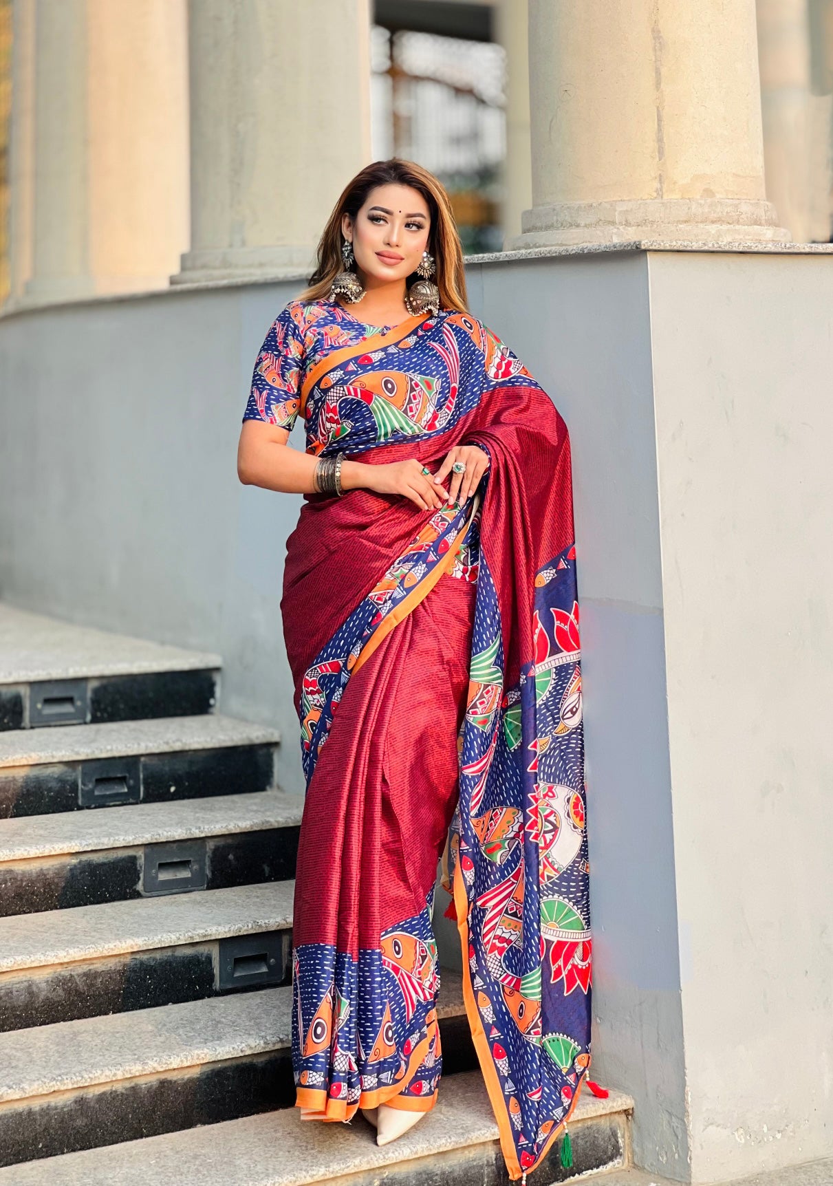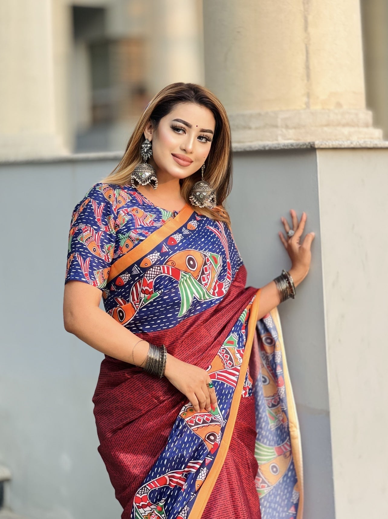 This piercing orange and black soft raw silk saree is covered in the elaborate artwork and hues of Bengal. The fish design along the border elevate the look of the saree. The contrast created between these two captivating colours make perfectly suitable for any traditional occasion.