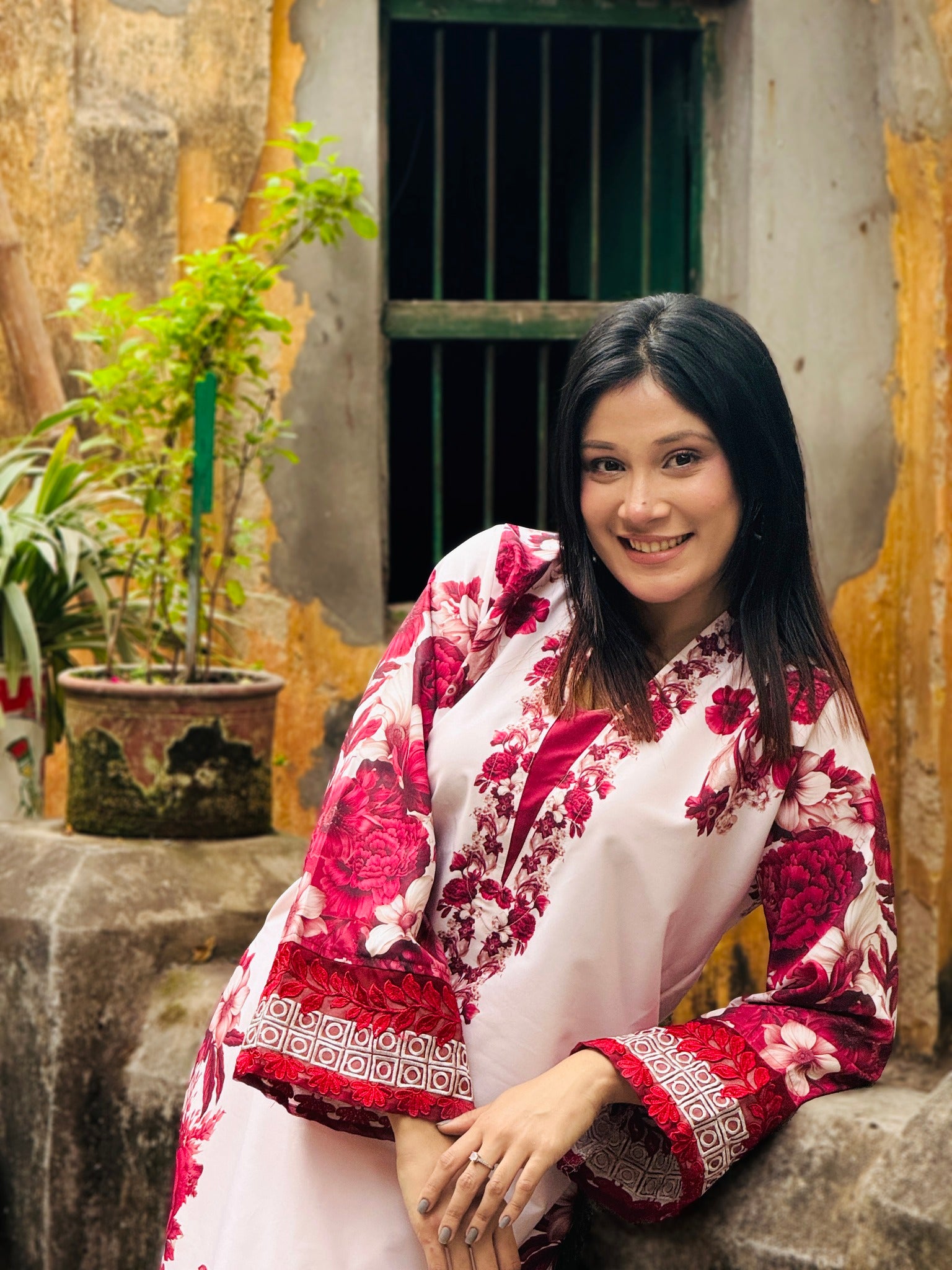 (অফ হয়াইট কালার এর উপর মেরুন ফ্লোরাল ডিজিটাল প্রিন্ট এর কাজ করা হয়েছে।)