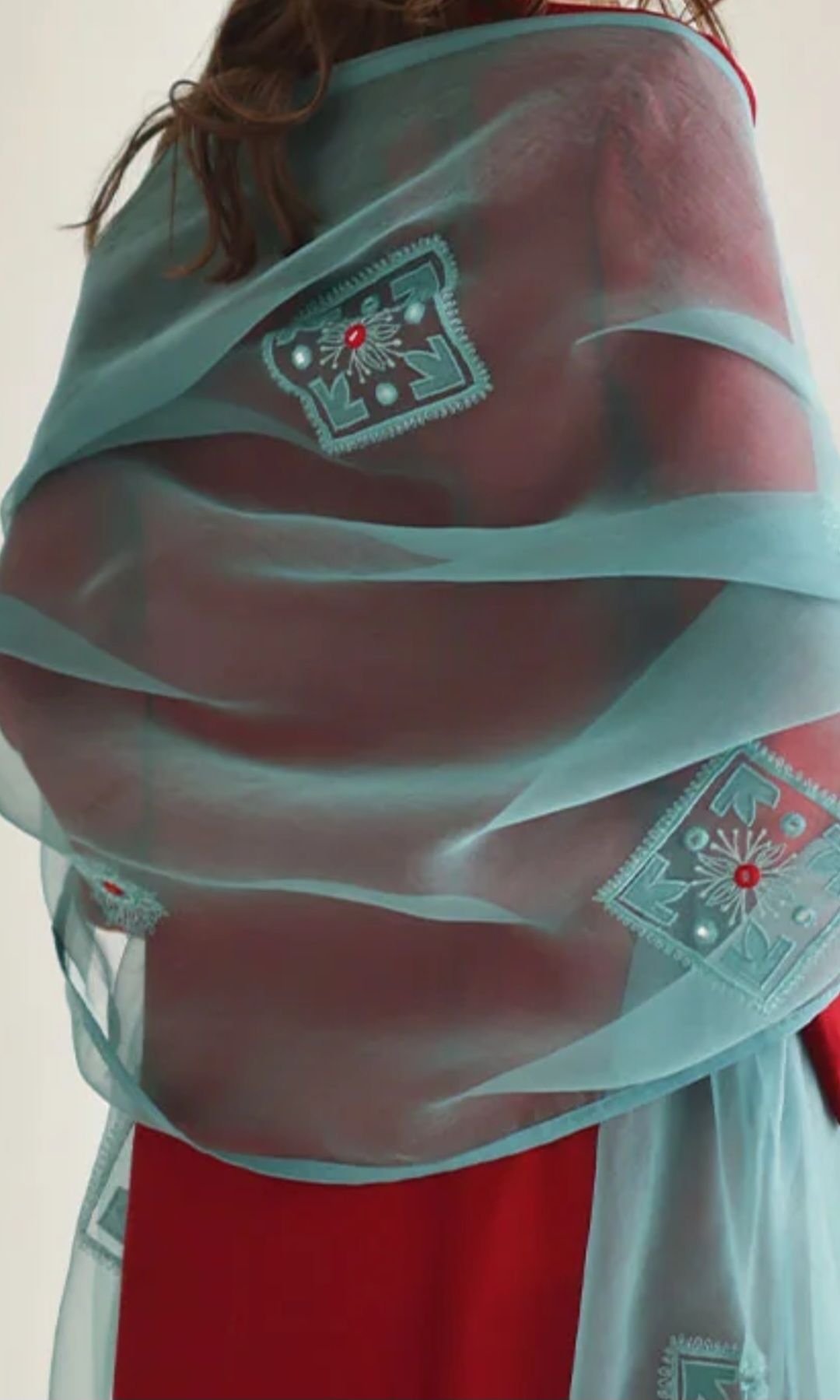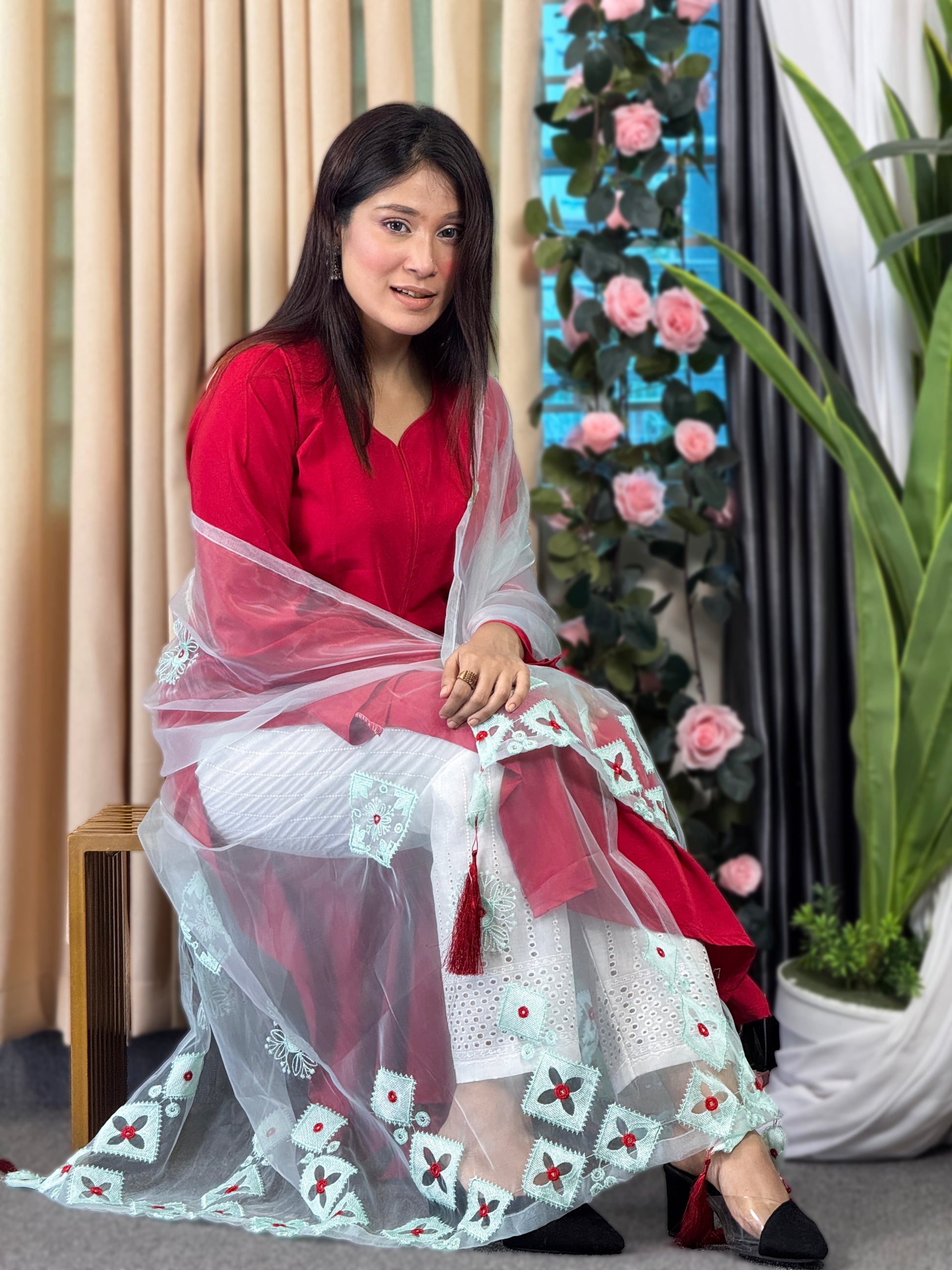 প্রিমিয়াম টিস্যু ফ্যাব্রিক্স এর ফুল বডি এমব্রয়ডারি & ট্যাসেল এর কাজ করা ওড়না থাকবে।